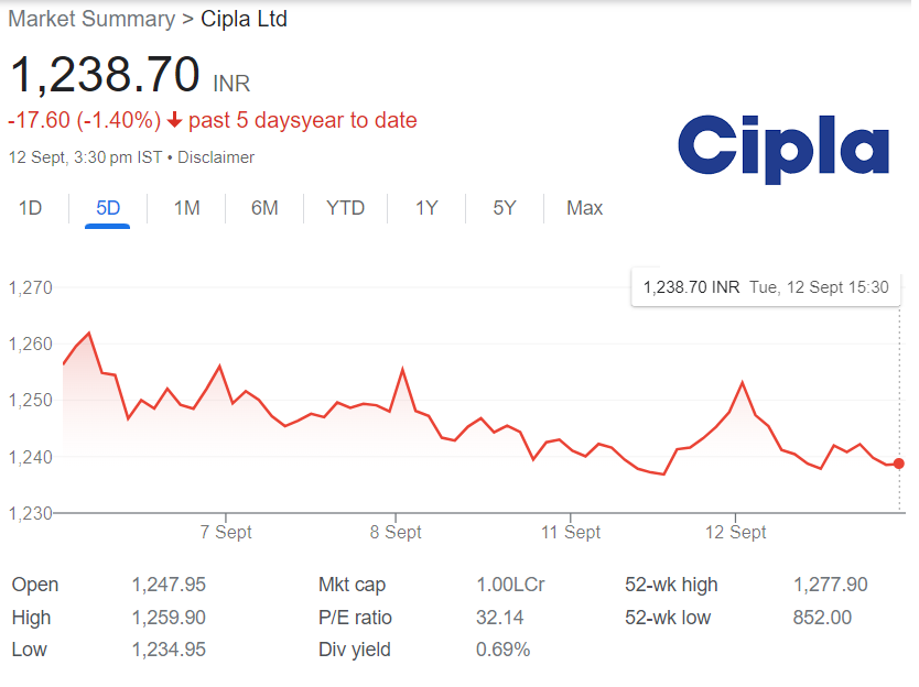 The current data for Cipla stock shows that the price is ₹1240.7. There has been a percent change of -0.35, indicating a slight decrease in value. The net change is -4.35, suggesting a decrease of ₹4.35 in the stock price. Overall, this data indicates a small decline in the value of Cipla stock.